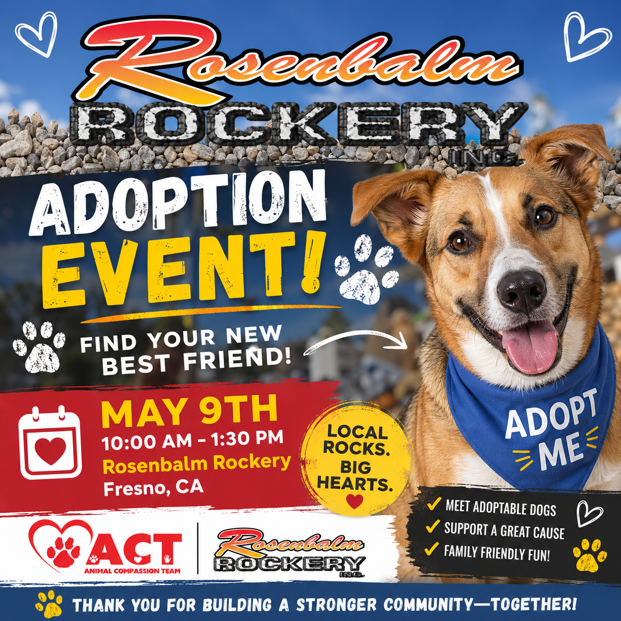 🌟 Adoption Event Alert! 🌟 Looking for your new best friend? 🐶💛 Join us for a tail-wagging good time at Rosenbalm Rockery on May 9th from 10:00 AM – 1:30 PM! Come meet some adorable, adoptable dogs who are ready to fill your life with love, laughter, and a whole lot of joy.